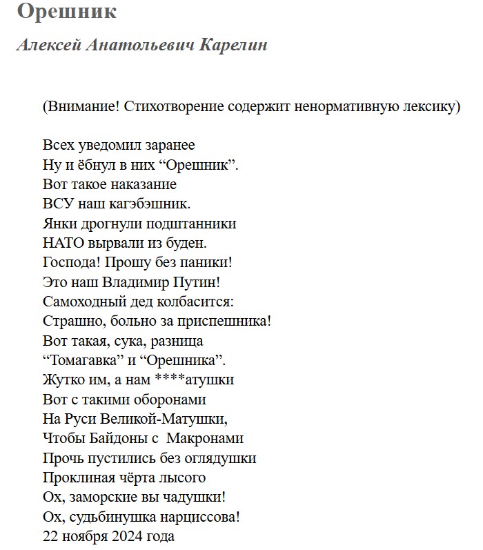 Ну и из того же ТГ - еще один шыдевр c фееричным припевом: "Путин, Лукашенко, Кадыров - на земле они гаранты мира". Ну прелестно же! Почему Прилепин ноет, что сейчас нет хорошей z-поэзии? А эта чем не нравится, Захарка, а?