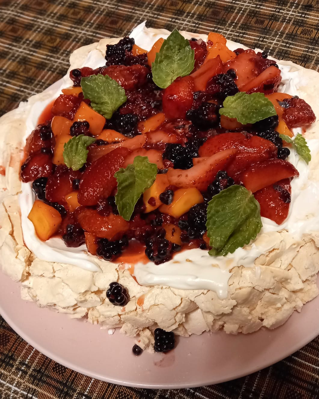 Безе, взбитые сливки 33%, клубника, манго, малина и ежевика. Листочки мяты