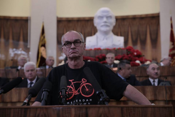 Мне больше интересно - что это на фото? Это со съезда? Что там сзади - бюст Ленина? Ленинское знамя? Гвоздики и флаги? Чувак с усами Берии? Надеюсь - это всё же с какой-то съёмочной площадки.