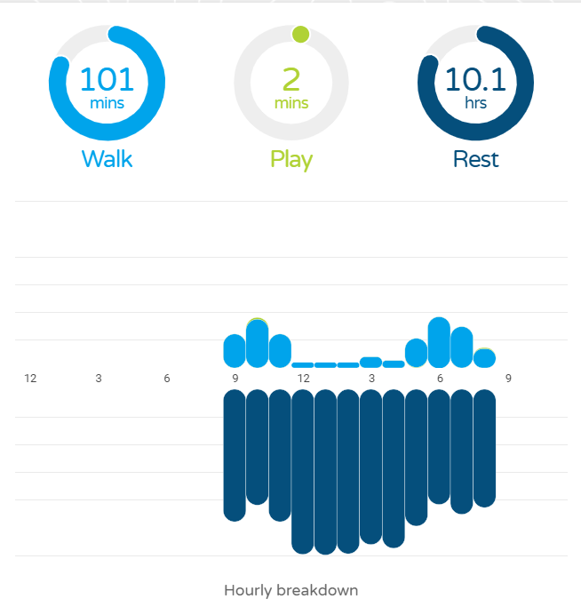 Дверца кота не выпускает гулять между 21:00 и 6:00 (приходить он может в любое время). Уходит гулять утром, потом к 8 приходит, спит, в течении дня может выйти, но, как правило, уходит гулять после 17:00 до 22:00. Как показывал его GPS трекер, даже будучи на улице, он не сильно "активничал". 10 часов отдыха (может - спал, может - лежал). С 22:00 до 5:00 он точно спит. Итого - 17 часов отдыха минимум 😄