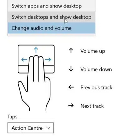 On the Touchpad Settings page, open the "Four-finger gestures" section and use the Swipes menu to change the function to "Change audio and volume." With this option in effect, you can swipe up or down (slowly) to adjust the system volume (see image, below)