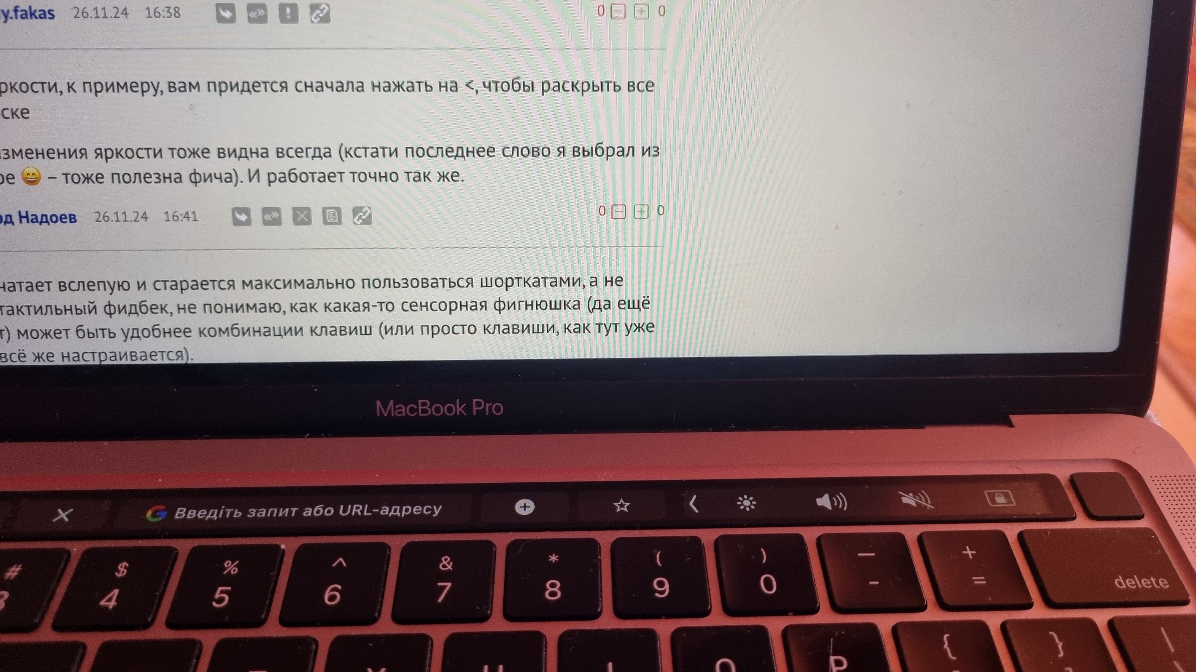 Как по мне, я ужасно страдаю, что не могу заказать модель с тач баром как минимум из-за регулировки громкости/яркости экрана одним движением пальца туда-сюда.