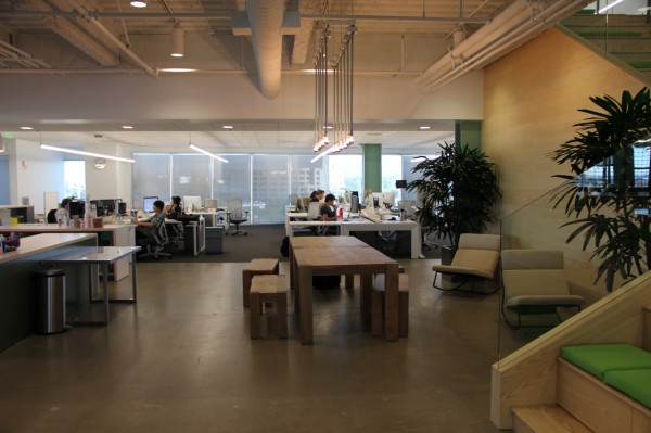 На этажах - здоровенные общие пространства, где нет даже кьюбиклов - просто столы.
