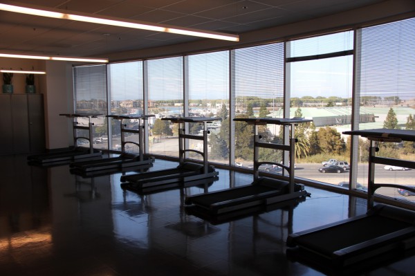 Со спортом тут тоже все в порядке: если захотелось походить или побегать не отрываясь от рабочего процесса - это запросто. Можно поставить ноутбук на столик дорожки, туда подведена сеть и есть адаптер питания, после чего ходишь и работаешь.