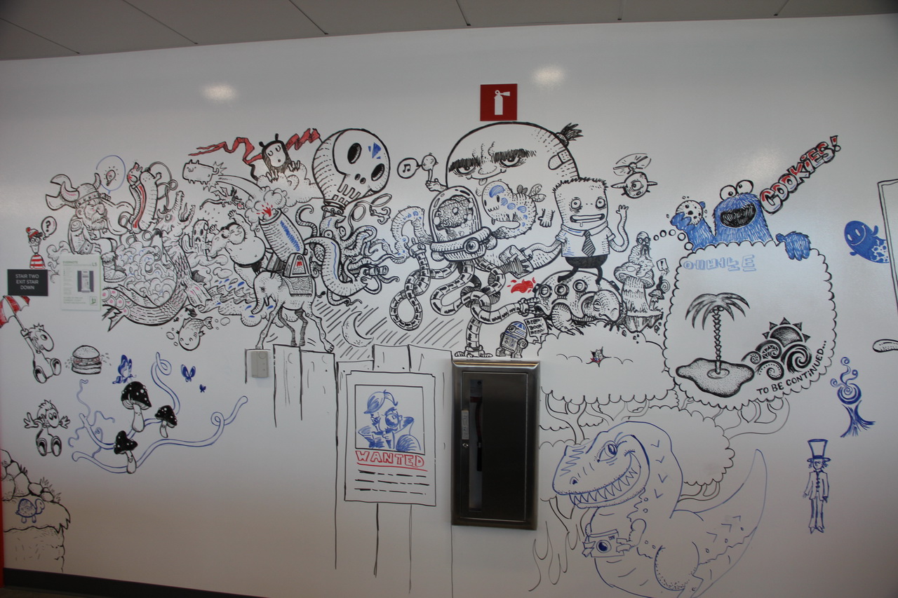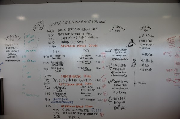 Стены офиса покрыты специальным светлым составом, который позволяет на нем писать фломастером, а потом стирать написанное. То есть редактировать. Вот на одной из главных стен - расписание конференции.