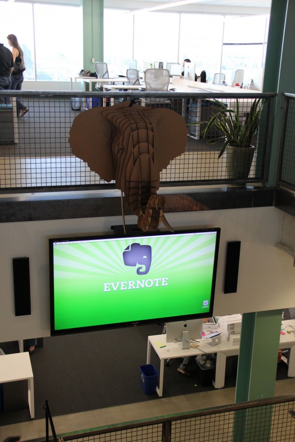 Над лестницей висит символ Evernote - слон. Почему слон? Потому что "Слоны никогда ничего не забывают" - есть такая старая фраза то ли из Киплинга, то ли из слоновника. Так что с помощью Evernote и вы можете стать слоном, никогда ничего не забывающим, особенно злобных дрессировщиков.