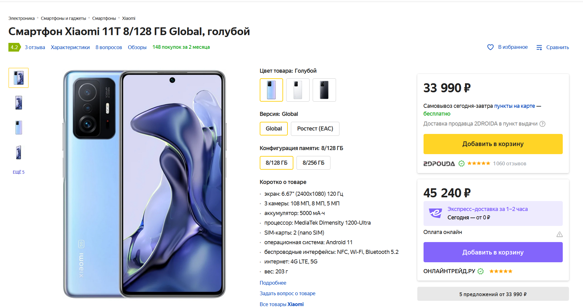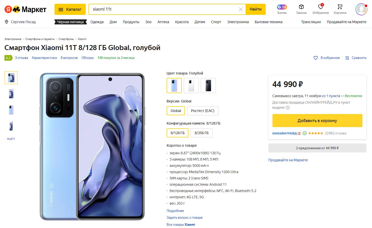Заинтересовала меня эта модель - Xiaomi 11T (Xiaomi убрали маркировку Mi в своей топовой линейке). Это типа такой как удешевленный Xiaomi Mi 11, который стоил очень дорого, а модель 11T сохранила основные характеристики флагманов, но стоит вполне разумных денег - в Яндекс.Маркете цена на этот смартфон начинается от 34 тысяч (но доходит до 45 тысяч), что достаточно недорого, учитывая его характеристики - вот полная спецификация
