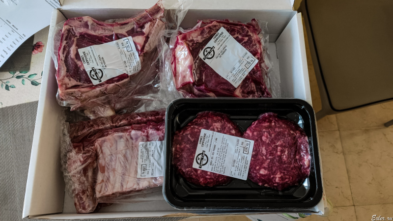 По поводу первого заказа. Чулетон из симментальской породы - был вообще бомба. Чулетон просто из состаренной говядины был очень так себе, на троечку. (При том, что стоили они практически одинаково). Антрекоты из состаренного мяса - ну, просто нормальные антрекоты. Бургеры (амбургесы) из состаренного мяса - отличные, обязательно буду еще заказывать. Энтранья (стейк мясника) очень средненько, жестковатая получилась, хотя вроде готовил по всем правилам. Говяжье филе (заказывал чисто добить заказ до определенной суммы, чтобы доставка была бесплатная) - вообще ни о чем: тушил полтора часа - все равно жесткое мясо. Но я вообще говяжье филе почти никогда не покупаю и не готовлю - так что, возможно, мой косяк.