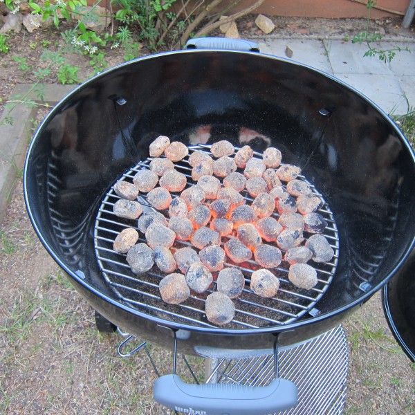 Через 10 минут все угли разгорелись, можно начинать готовить. (Я как вспомню растопку мангала, так вздрогну - это целое дело. А здесь засыпал, поджег, 10 минут пьешь пиво, потом можно заряжать мясо.)