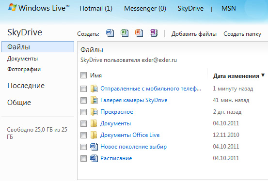 SkyDrive - это облачный сервис Microsoft, в котором для каждого зарегистрированного (получившего Windows Live ID) пользователя выделяется 25 Гб пространства для хранения документов, изображений и любых других файлов.