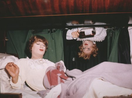 На IMDB большинство фотографий к фильму "В джазе только девушки" - цветные. Интересно смотрится, ведь мы так привыкли к тому, что фильм - черно-белый. Кстати, Уайлдер и собирался снимать его в цвете, но ему не понравилось, как смотрелись лица Леммона и Кертиса на фоне женских платьев. Поэтому он его сделал черно-белым.