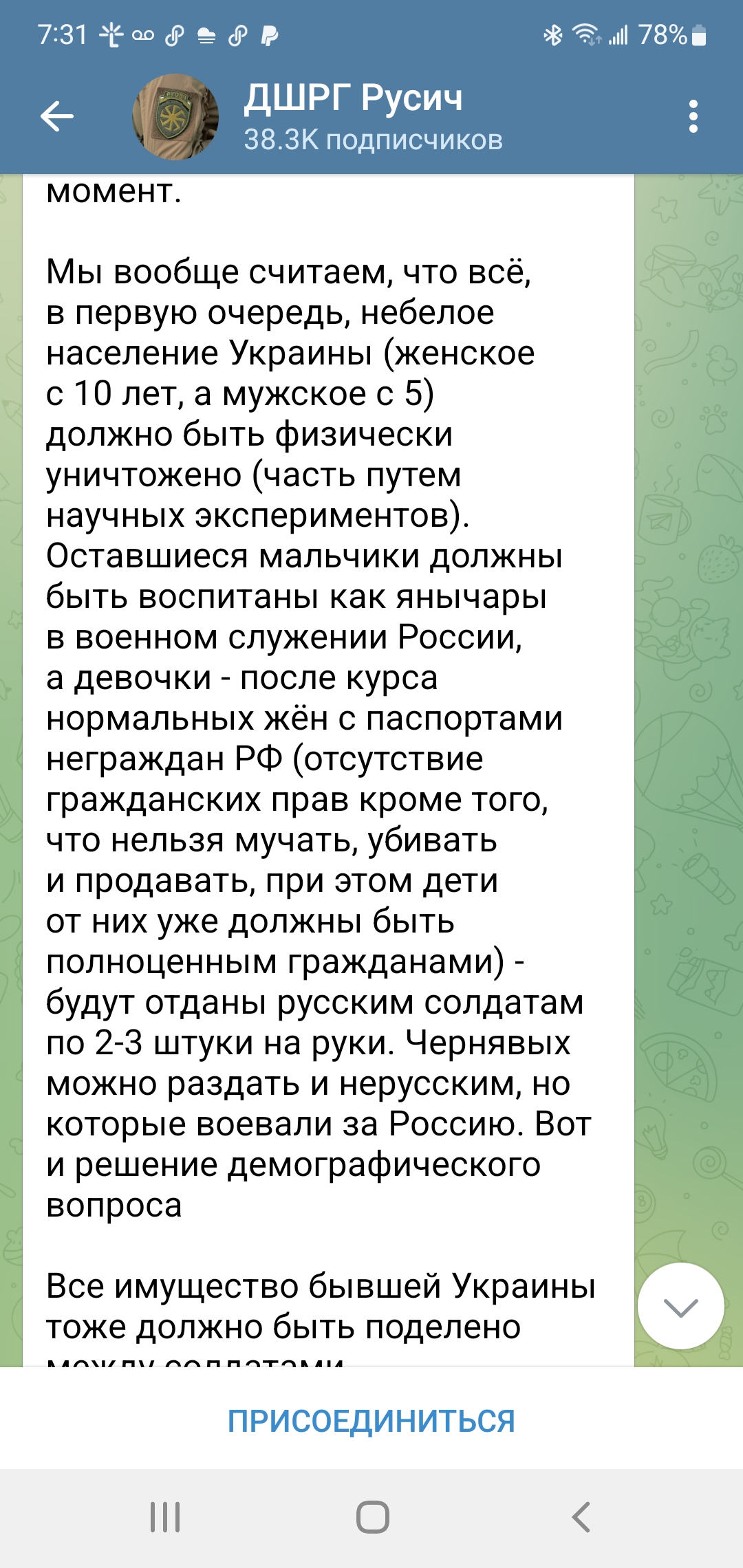 Эти твари ваще отбитые наглухо. Я иногда читала их высеры на канале в Телеге и вывод только один- отстреливать этих "русичей" без всякой жалости. Страшно, что у них хватает не то чтобы последователей, но тех, кто с ними согласен во всём, правда почему-то становиться чмобиками эти "диванные воины" не желают, либо валят через границу, либо стараются избежать повестки любыми другими способами.