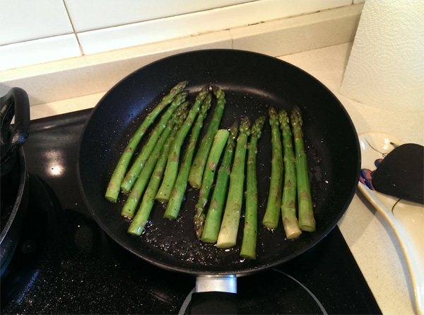 Теперь я делаю по-другому. Покупаю толстую зеленую спаржу и жарю ее на небольшом огне на оливковом масле с чесноком и специями не больше 10 минут. Спаржа обжаривается, но остается хрустящей. В предыдущем варианте она была заметно более прожарена и уже не хрустела. Этот вариант мне нравится намного больше. Только нижнюю, побелевшую часть спаржи лучше отрезать - она при жарке остается твердой.