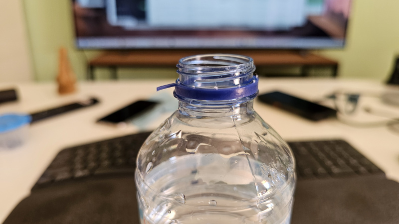 Вот теперь воду из бутылки спокойно можно пить. Попил, крышку накрутил - поставил. Допил - выкинул бутылку с крышкой в пластик. А это пластиковое кольцо я, разумеется, выкидываю в обычный мусор: не буду же специально бежать вниз на кухню к пакету с пластиком, чтобы выкинуть кольцо. Бутылку - буду выкидывать в пакет с пластиком, кольцо - не буду. Так что поздравляю евробюрократов. Они все-таки добились того, чтобы я какой-то пластик выкидывал в обычный мусор!