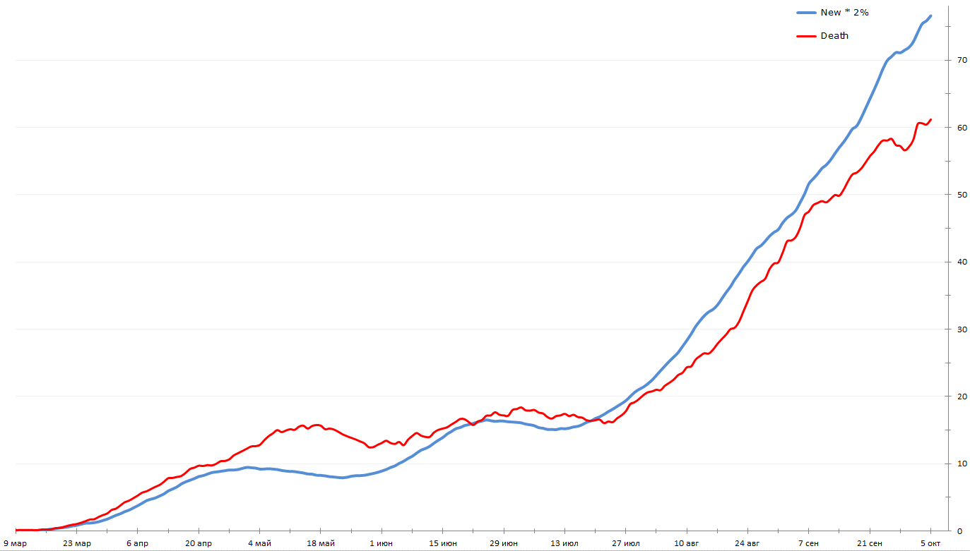 Но я сейчас о другом. О том, что даже нынешний сравнительно мягкий карантин людям сложно терпеть долго и они начинают его понемногу саботировать. Я не вижу других объяснений почему один и тот же уровень ограничений сдерживал рост в июне-июле, но перестал сдерживать в августе-сентябре.
