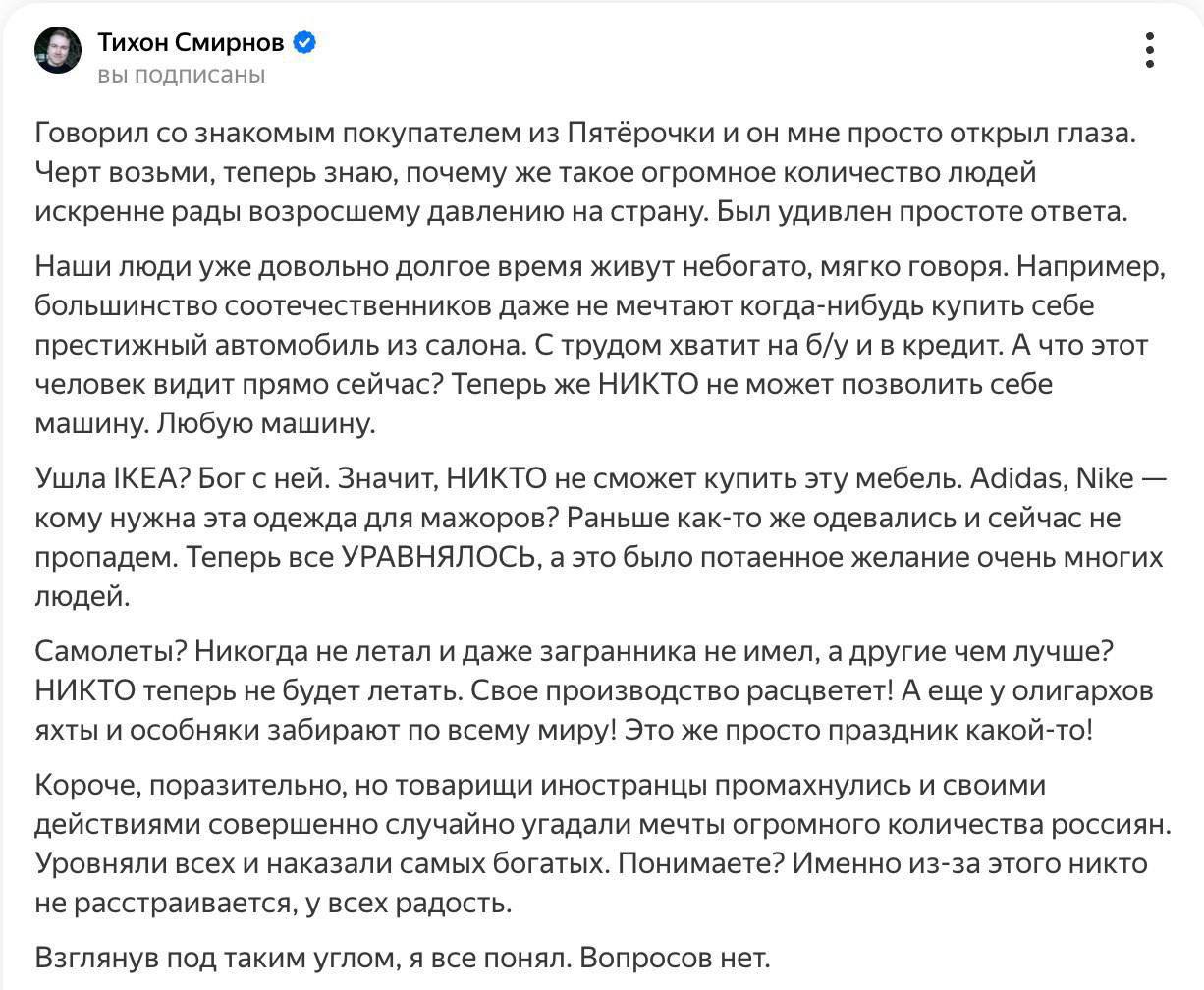 Мне сегодня парикмахер рассказал, что ВВП умный, потому, что теперь можно купить акции Макдональдс за копейки. А потом про Макрона, который сообщил, что французскому народу придется тяжело - на все взлетят цены.