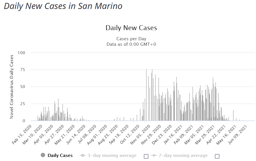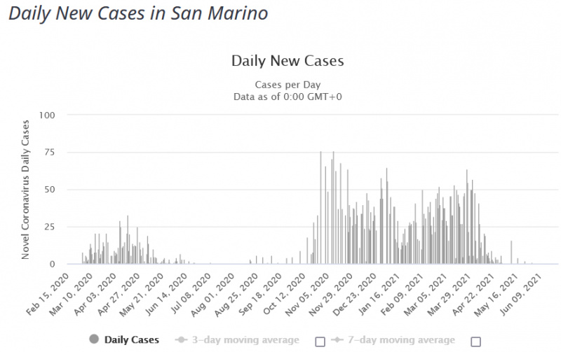 «На сегодняшний день введено 36 тысяч доз вакцины, 22 тысячи человек уже получили первую дозу, 14 тысяч — обе», — уточнил 12 мая министр здравоохранения республики Роберто Чиаватта. «Не считая Гибралтара, мы — первые в Европе и седьмые в мире по темпам вакцинации», — добавил он в фейсбуке.