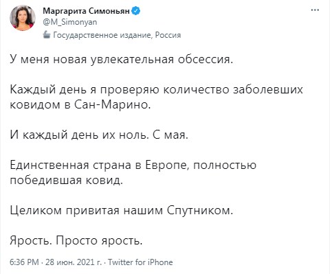 Министр заметил, что хотя республика еще не отчиталась об эффективности «Спутника V» в научных публикациях, имеющиеся у него данные «говорят об эффективности, близкой к 100% через три недели после второй дозы вакцины». Чиаватта подчеркнул, что в Сан-Марино ни осталось ни одного жителя, госпитализированного с COVID-19 — последний пациент с этим диагнозом был выписан 11 мая, а ковидный госпиталь в республике был закрыт. (Отсюда.)