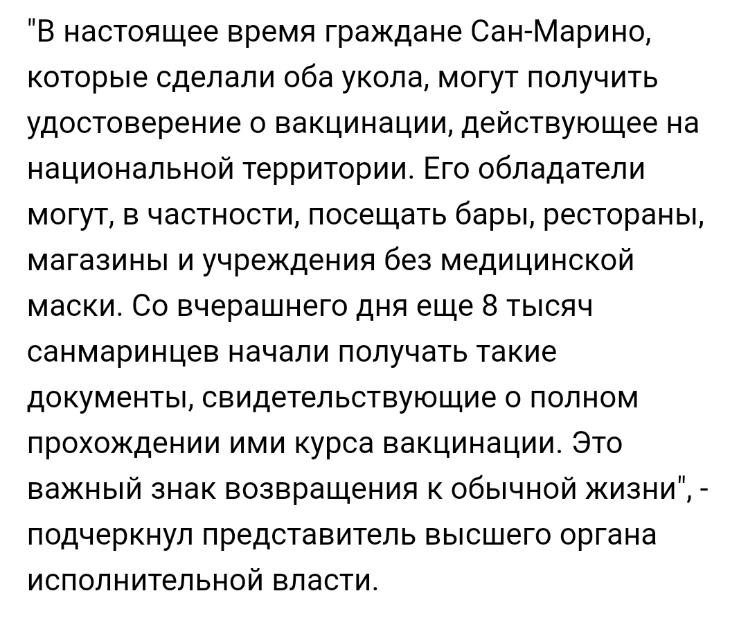 Чуть больше месяца назад сообщали о том, что жители государства Сан-Марино, которое было на 6 месте в мире по распространяемости коронавируса (понятно, что это карликовое государство размером примерно в две наши Калейи - там живет 34 тысячи человек), массово привились российской вакциной "Спутник V" (потому что другой достать не могли). И стали первой европейской страной без коронавируса.