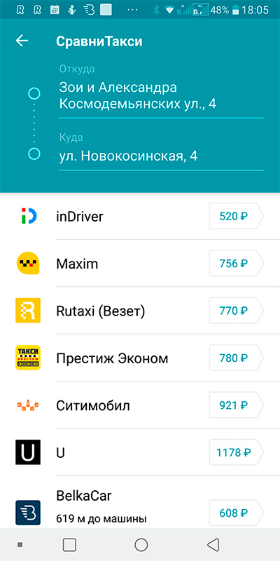 Если вдруг кто не знает, приложение "СравниТакси" (есть под Android и iOS) позволяет сравнивать цены на конкретные поездки в разных службах такси и каршеринга. Очень наглядно и удобно.