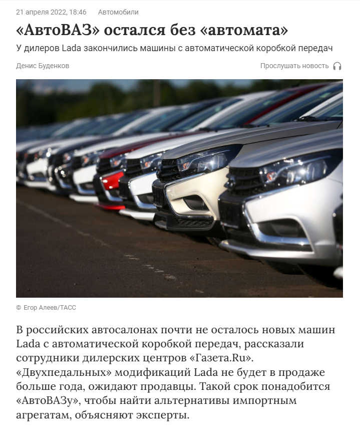 «Автомобилей с «автоматом» нет и не будет. Эта ситуация продлится год, а может и два. Уверен на 99%, что уже через пару месяцев вы вообще не найдете Lada с «автоматом», – рассказал менеджер дилерского центра Lada в Тольятти.