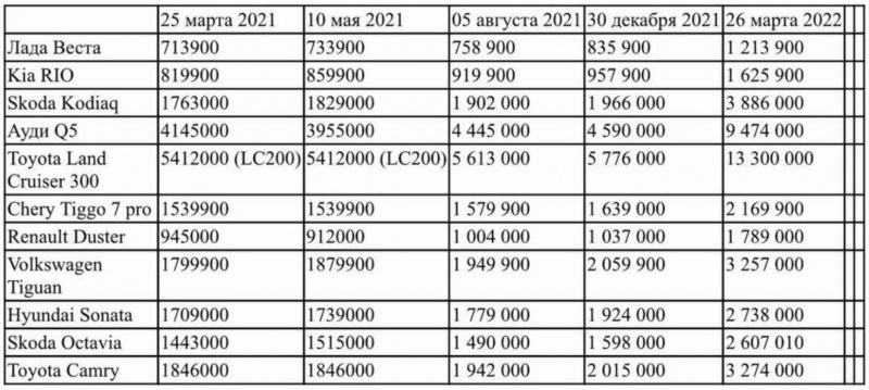 Конкретно Land Cruiser в этой табличке лишний: с новым LC300 шиза имеет глобальный характер -- даже в Японии очередь на несколько лет и б/у стоят вдвое дороже официальной цены новых.