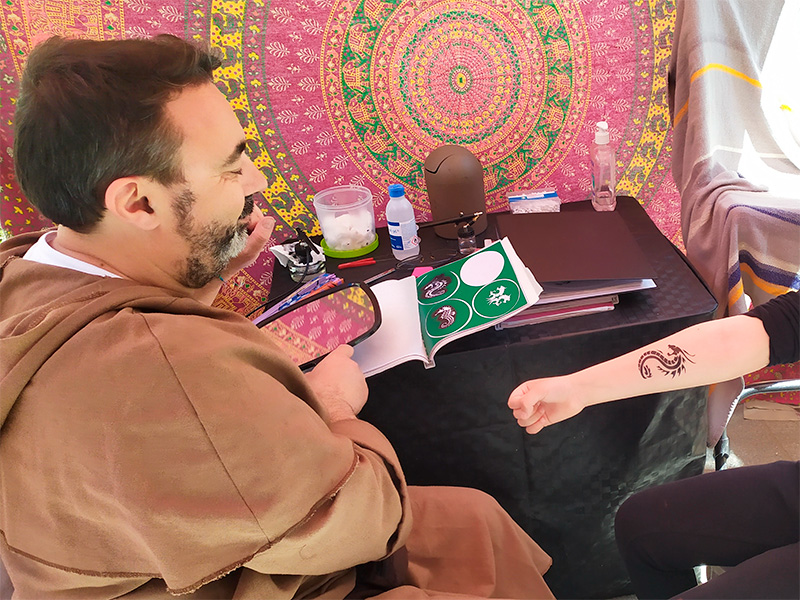Была палатка с тату для детишек (временные, разумеется, держатся дней 10-15 - это просто краска). Юный Каталан потребовал набить себе дракона. Имеет право. Стоимость - пять евро, набивается по трафарету.