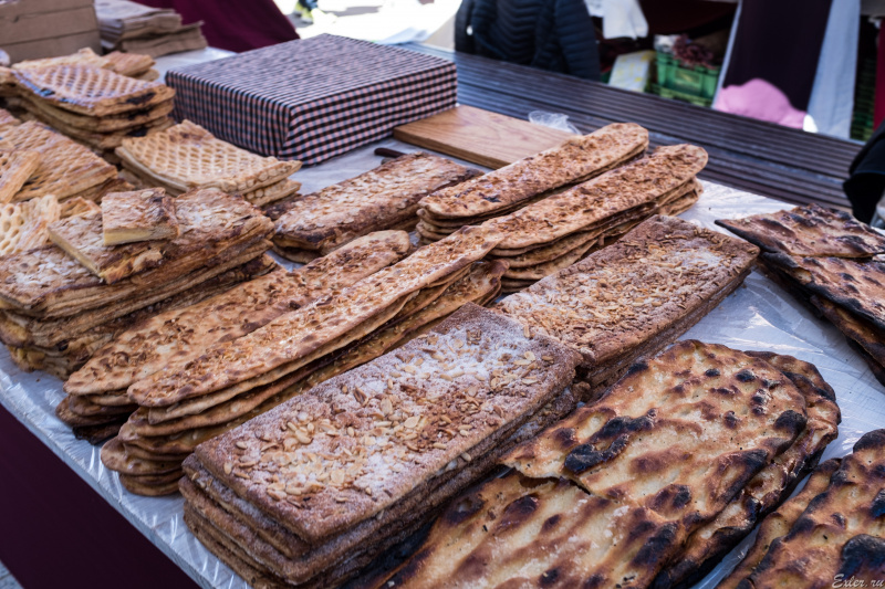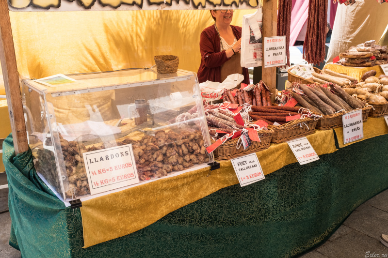 На первом плане слева - Llardons. Страшно популярная штука - холодные шкварки. То есть свиное сало, обжаренное и охлажденное. Постоянно на ярмарках продается, раскупается отлично. Дениса Руденко этой штукой угостили в одном из винных хозяйств (производящих каву, игристое) - ему очень понравилось.