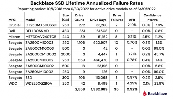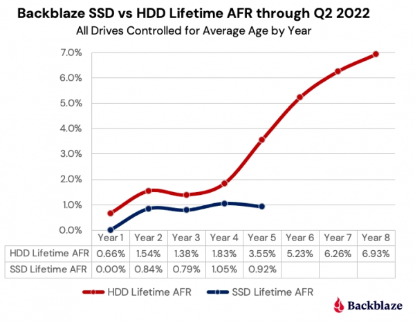 Последний год наблюдений ограничился вторым кварталом 2022-го. На текущий момент компания «потеряла» 3,55% HDD и 0,92% SSD — разница в количестве отказов оказалась почти четырёхкратной.