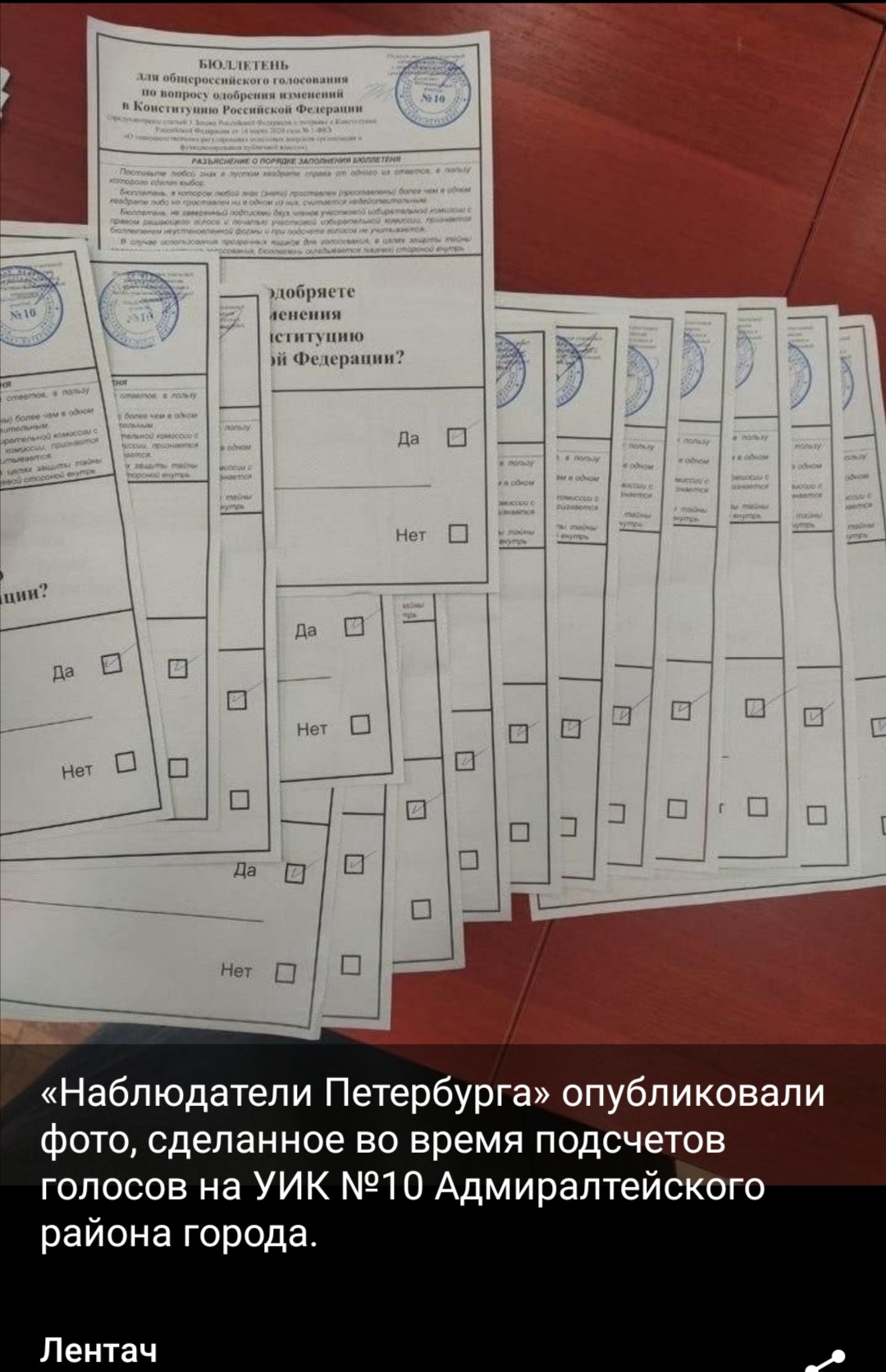 "Один из петербургских УИКов отчитался о стопроцентном голосовании против поправок к Конституции РФ. Согласно данным системы «ГАС-Выборы», на участке зарегистрировано всего пять избирателей. Все они получили свои бюллетени и проголосовали единогласно против.