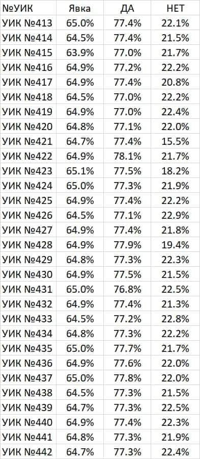 Результаты "голосования" на нескольких участках. Но мне прям даже интересно: что за безумный начальник (начальница) УИК 415, который посмел(а) нарисовать явку 63.9 вместо положенных 64 и чуть больше? Вольнодумством попахивает, да!