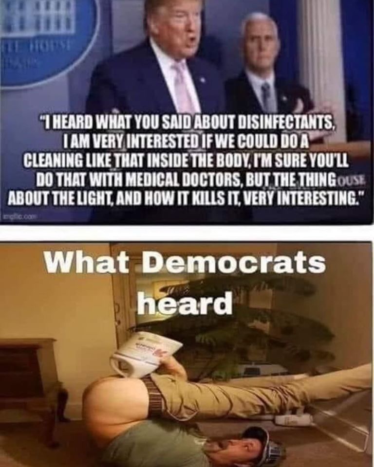 Пару дней назад Трамп, во время ежедневного брифинга, посвященного текущей ситуации и мерам борьбы с короновирусом, предложил лечить заболевших хлорным отбеливателем и жестким ультрафиолетом, заливая и засовывая их внутрь больному. Теперь утверждает, что так "элегантно" пошутил (ну, типа, "это не грязь, это говно").