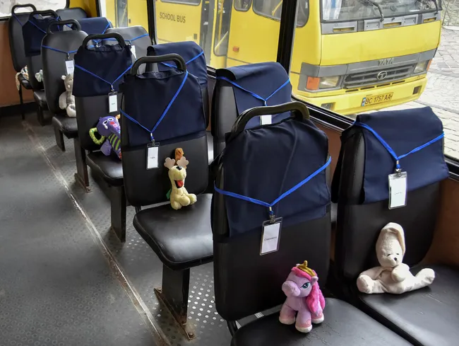 "1 июня, в Международный день защиты детей, во Львове провели акцию памяти 243 детей, которые погибли в Украине с начала войны. В центре города поставили пустые школьные автобусы с детскими игрушками и бейджиками с именами погибших на сидениях.