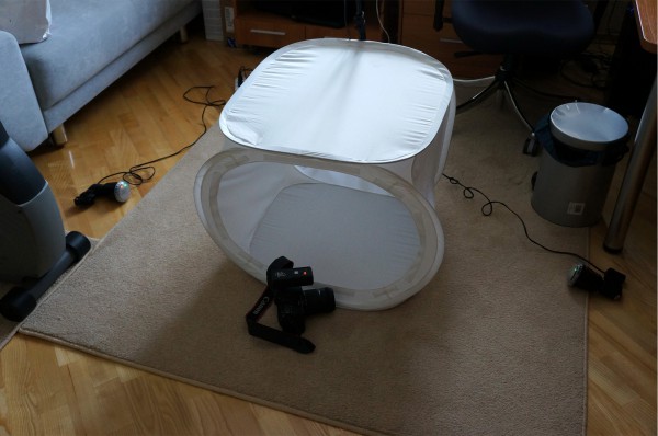 Вот так выглядит мой доморощенный стенд для фотографирования гаджетов. Лайт-куб, три лампы-вспышки (третья - на штативе над кубом, ее на фото не видно), инфракрасная "вспышка" для фотоаппарата, по сигналу которой срабатывают лампы-вспышки. Выдержка выставляется 1/160, ISO в 200, диафрагмой регулируется экспозиция (обычно ставится где-то 18-20).