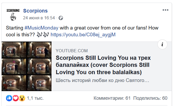 Кавер, на мой взгляд, получился совершенно чумовой, ну и вот он наконец-то добрался до самих "Scorpions" - они отреагировали на своей странице в Facebook.
