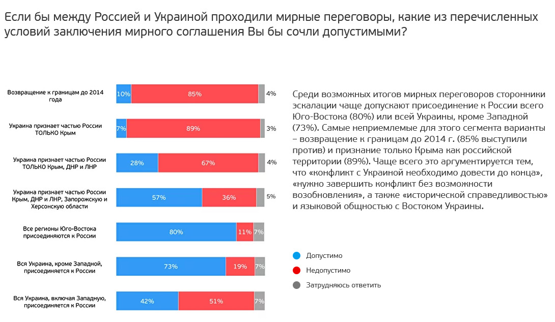 Из сторонников эскалации (27%) не допускают возврат к границам до 2014 90%. Итого 24,3% от всех опрошенных.