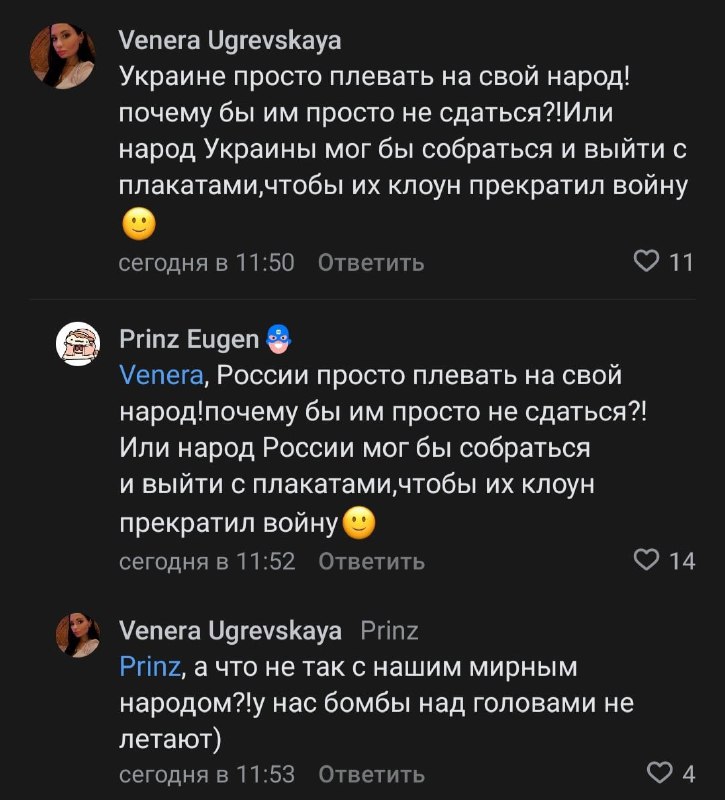 "...Мы - не людоеды, мы нормальные люди, которым нужен мир, но русский мир на наших условиях. Мы тоже против войны, но ее окончание возможно только в виде тотальной русской Победы и уничтожения нашей Звезды Смерти, Украины и ее сторонников, как сгустка русофобии и сатанинских сил.