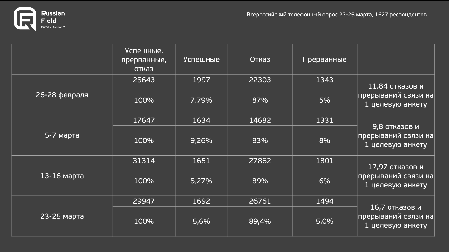 Мне когда прислали ссылку на это исследование, то я поначалу подумал, что подобные опросы мало чего стоят, потому что даже при анонимных ответах по телефону человек не скажет, что он против войны - чревато. Однако опрос проводили профессионалы, и они очень аккуратно сформулировали вопросы, так что даже при всем желании там никого нельзя обвинить в "дискредитации аккредитованных вооруженных сил РФ".