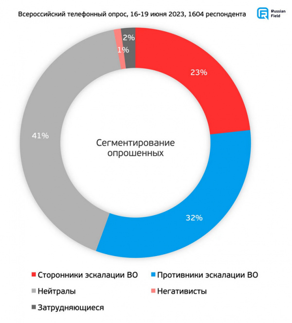 Независимая социологическая служба Russian Field провела очередной опрос по поводу реального отношения россиян к так называемой СВО. Опрошено было 1604 респондента в самых разнообразных регионах. Респонденты были разделены на несколько групп, исходя из вопросов анкета: сторонники эскалации ВО, нейтралы, негативисты, противники эскалации ВО.