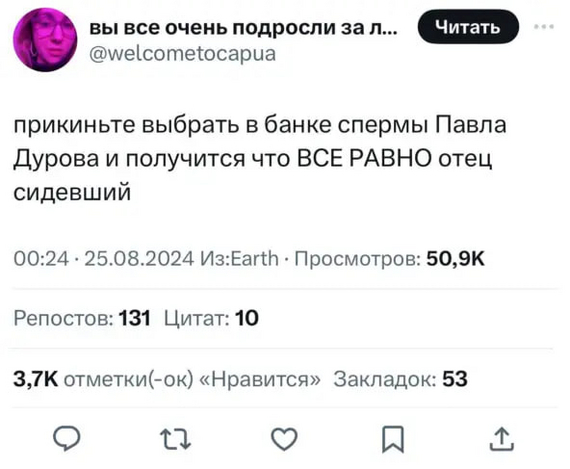 Мы впрягаемся не за личность Павла Дурова, а за ПРИНЦИП. Этот принцип – краеугольный камень Западной цивилизации. То, что вывело именно Запад из тьмы Средневековья, позволило построить тот сытый процветающий мир, что мы знаем. Свобода слова – не «надстройка», а самый что ни на есть глубинный «базис» цивилизации. В свободном обмене идей происходит эволюция рациональных мемов, рождается новое знание, бескровно решаются конфликты, бесконечная вековая резня государственных банд превращается в прогресс. Без этого Запад превратится в азиатчину, прогресс остановится, сменится упадком и одичанием. На планете 193 государства и только 2 (ДВЕ!) крупных независимых соцсети: Телеграм и Х. Каждая из них в 96,5 раз важнее для Человечества, чем хотелки бюрократов любого из 193 государств. Эта цель стоит того, чтобы за неё бороться".