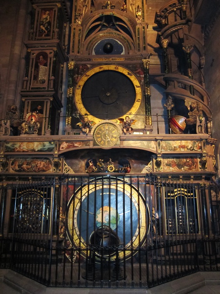 Ниже - уникальный механизм, который находится в Страсбургском соборе. Он показывает календарь, время, лунные фазы и так далее.