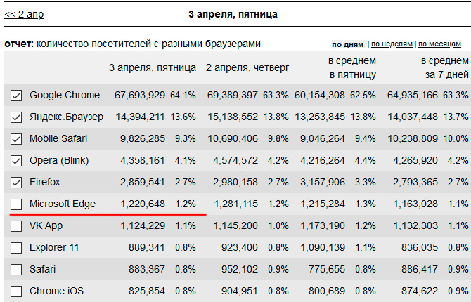 Длительное время в сегменте браузеров лидирующую позицию с большим отрывом занимает Chrome. По итогам марта веб-обозреватель компании Google занимал 68,50 % рынка. Вышедший на второе место Microsoft Edge используется на 7,59 % устройств. (Отсюда.)