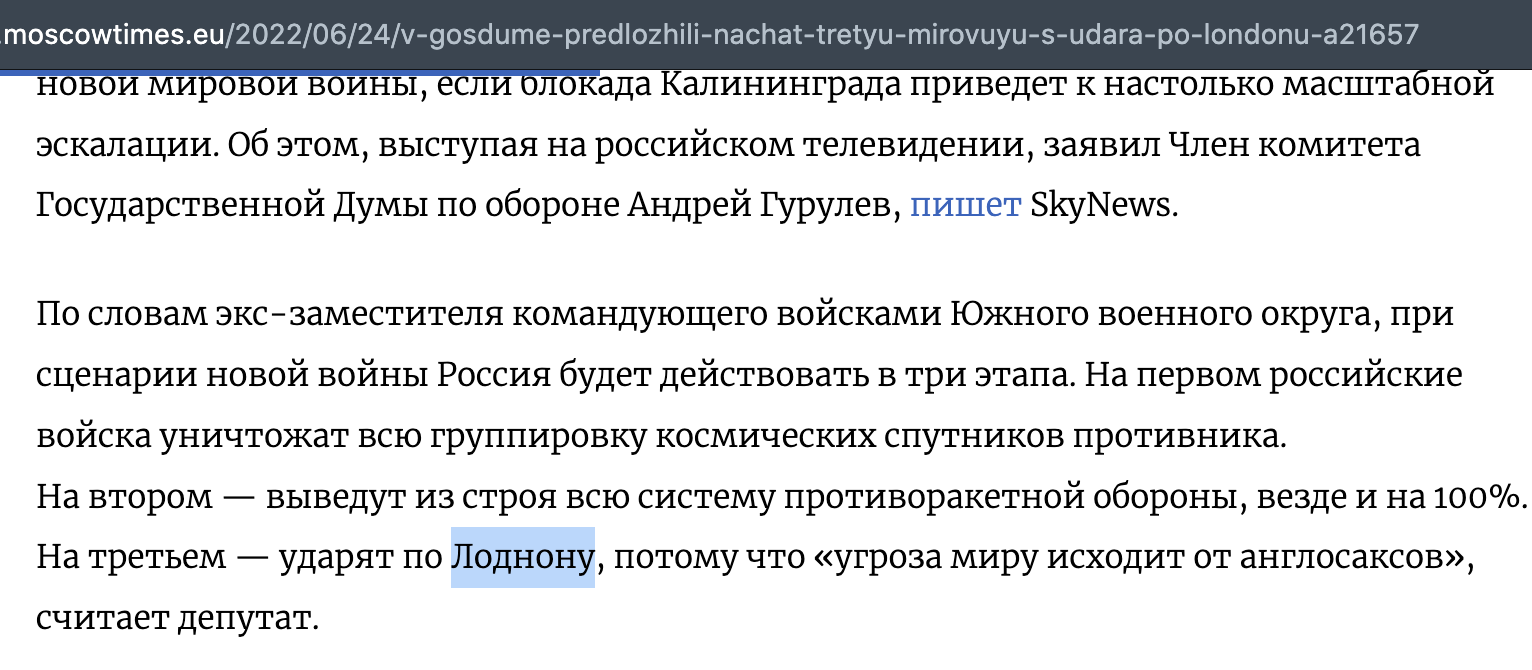 Лондон рискует стать первым городом, который подвергнется бомбардировке в случае новой мировой войны, если блокада Калининграда приведет к настолько масштабной эскалации. Об этом, выступая на российском телевидении, заявил Член комитета Государственной Думы по обороне Андрей Гурулев, пишет SkyNews.