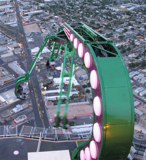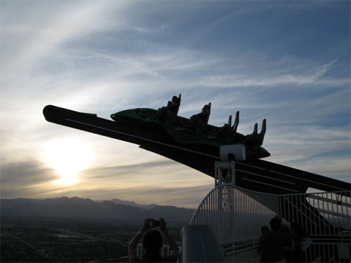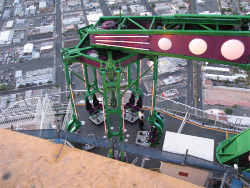 Вчера после конференции выбрались в "Стратосферу", чтобы, как полагается, плюнуть с эдакой высотищи. Заодно хотели посмотреть атракционы, о которых говорили здесь. Аттракционы оказались на месте. Этот рельс, который обрывается над бездной - фигня полная. То есть прокатиться на нем, конечно, страшно - слов нет, но сам аттракцион - не фонтан: прошлый, когда кабинки катались по рельсам, висящим над пропастью, вокруг башни, был прикольный.