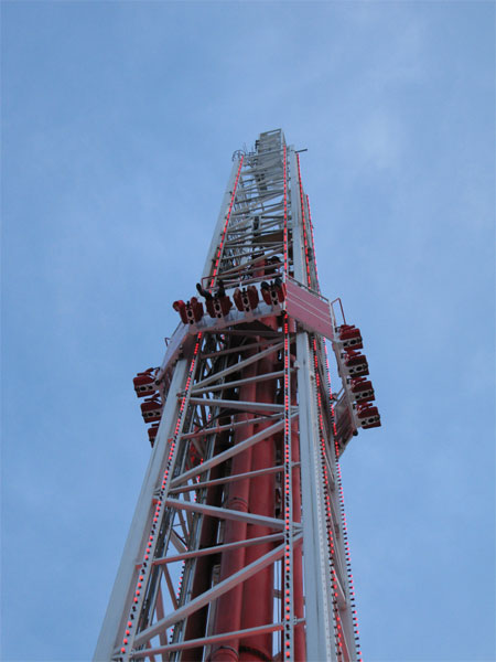 А потом эта штука выезжает за пределы башни и начинает довольно активно крутиться. А ты сидишьна маленьком креслице у которого даже боковых ручек толком нет. Конечно, тебя прижимает специальным устройством, так что вниз не упадешь. Но высота башни - чуть повыше, чем Останкинская. Так что ощущения, как вы понимаете, довольно интересные. 99% людей, когда креслица выезжают за ограду, думают про себя: "Какого хрена я сюда залез за свои же деньги?!!"