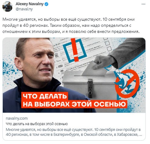 Осталось понять, как Навальный, который это написал, связан с тем Навальным, который написал запощенный мною текст? И да, какдое сомнение и двузначность в формулировках я буду трактовать не в пользу Навального. Не хотел бы писать -- не написал бы. Просто промолчал или обошел. Написал? Все, это твое мнение. В том числе о том, что делать в связи с ожидаемыми выборами, включая оккупированные территории. И можно мне не тыкать другие тексты, мутные или не очень.