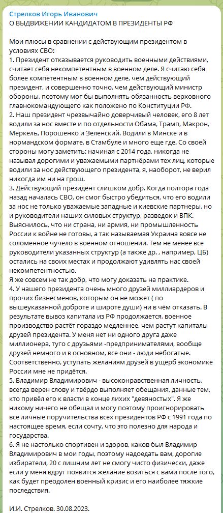 >>>Подтверждение о том, что Игорь Стрелков готов выдвинуть себя кандидатом в президенты, есть.