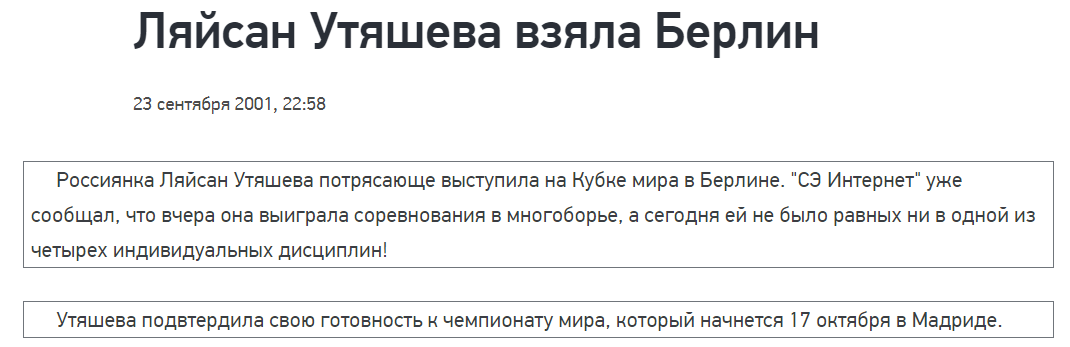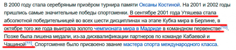 К тому же Кабаева перечислила конкретные соревнования, на которых Лайсян действительно не завоевывала золото в личке. Да ещё и уточнила про многоборье, так что победы в отдельных дисциплинах сюда тоже не подпадают. В общем формально, увы, её утверждение о том, что там не завоевывала Утяшева, не является ложным.