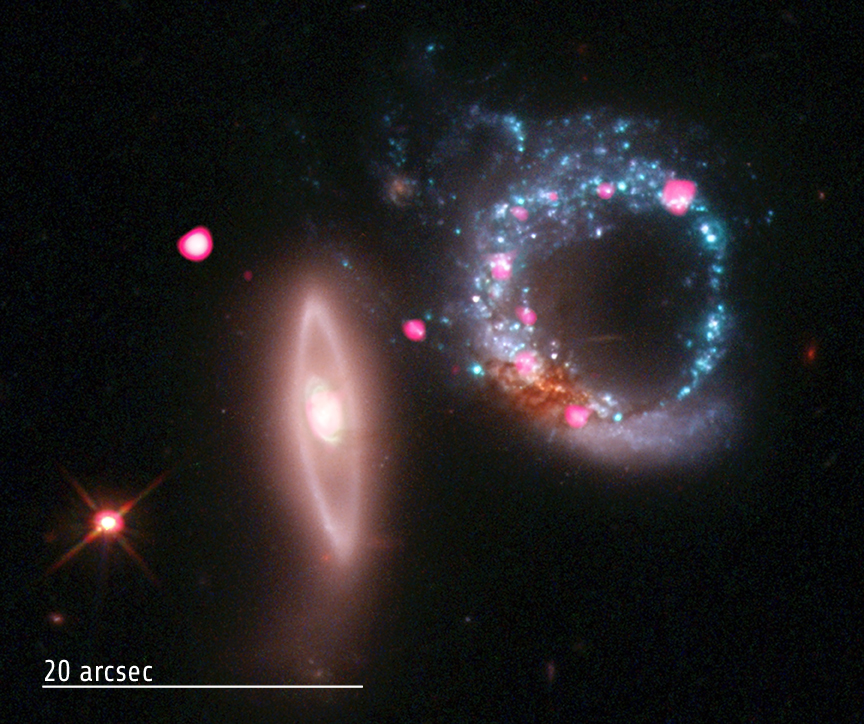 Вот моя любимая фотография, прозванная космической валентинкой. Это объект Arp 147 (№147 из каталога Арпа). Это две галактики. Левая, эллиптическая, пролетела сквозь правую спиральную, проделав в ней дырку от бублика. Ударная волна вызвала вспышку звездообразования в бублике, из-за чего появилось много массивных звезд класса О, которые вспыхнули как сверхновые и образовали много черных дыр. ЧД отмечены на фото малиновым.