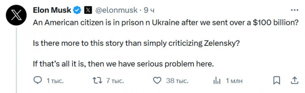 Товарищ Илон Маск обеспокоился судьбой американского гражданина Гонсало Лиры и написал в своей Х-сети: "После того как мы отправили Украине сто миллиардов долларов, они еще и посадили в тюрьму американца? Может, дело не только в критике Зеленского? Потому что если только в ней, тогда у нас большие проблемы".
